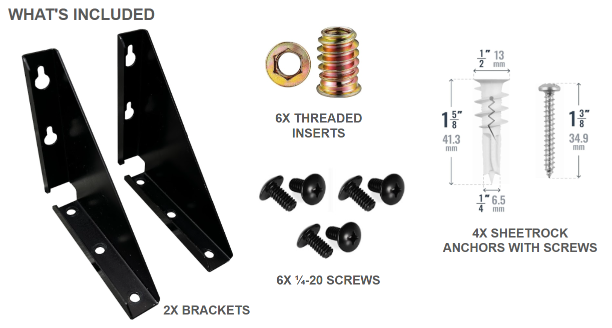Included: 2 Black Brackets, 6 Bracket Screws, 4 Sheetrock Anchors with Screws, 6 Threaded Inserts for Wood