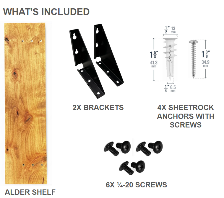 Included: Wood Shelf, 2 Black Brackets, Mounting Template, 6 Bracket Screws, 4 Sheetrock Anchors with Screws